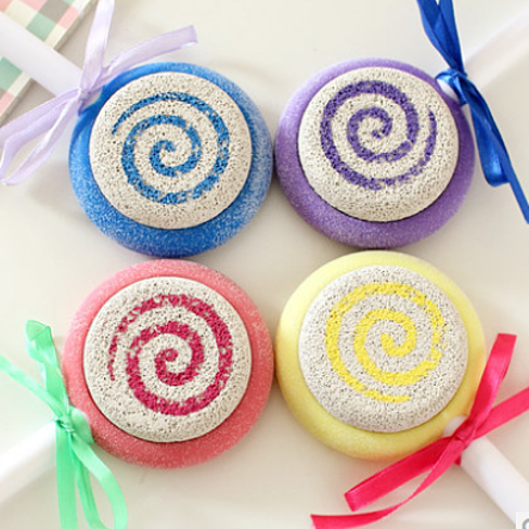 this adorable foot exfoliating pumice stone comes in a fun lollipop design to make your next pedicure a little extra fun. the unique design also makes it easy to handle. a random color is selected for your order.
