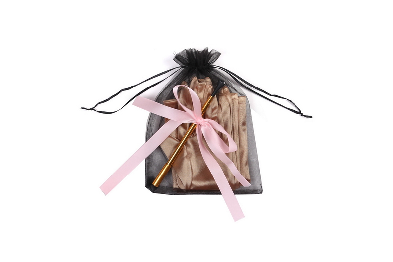 Packaged in chic black satchel bag and pink ribbons