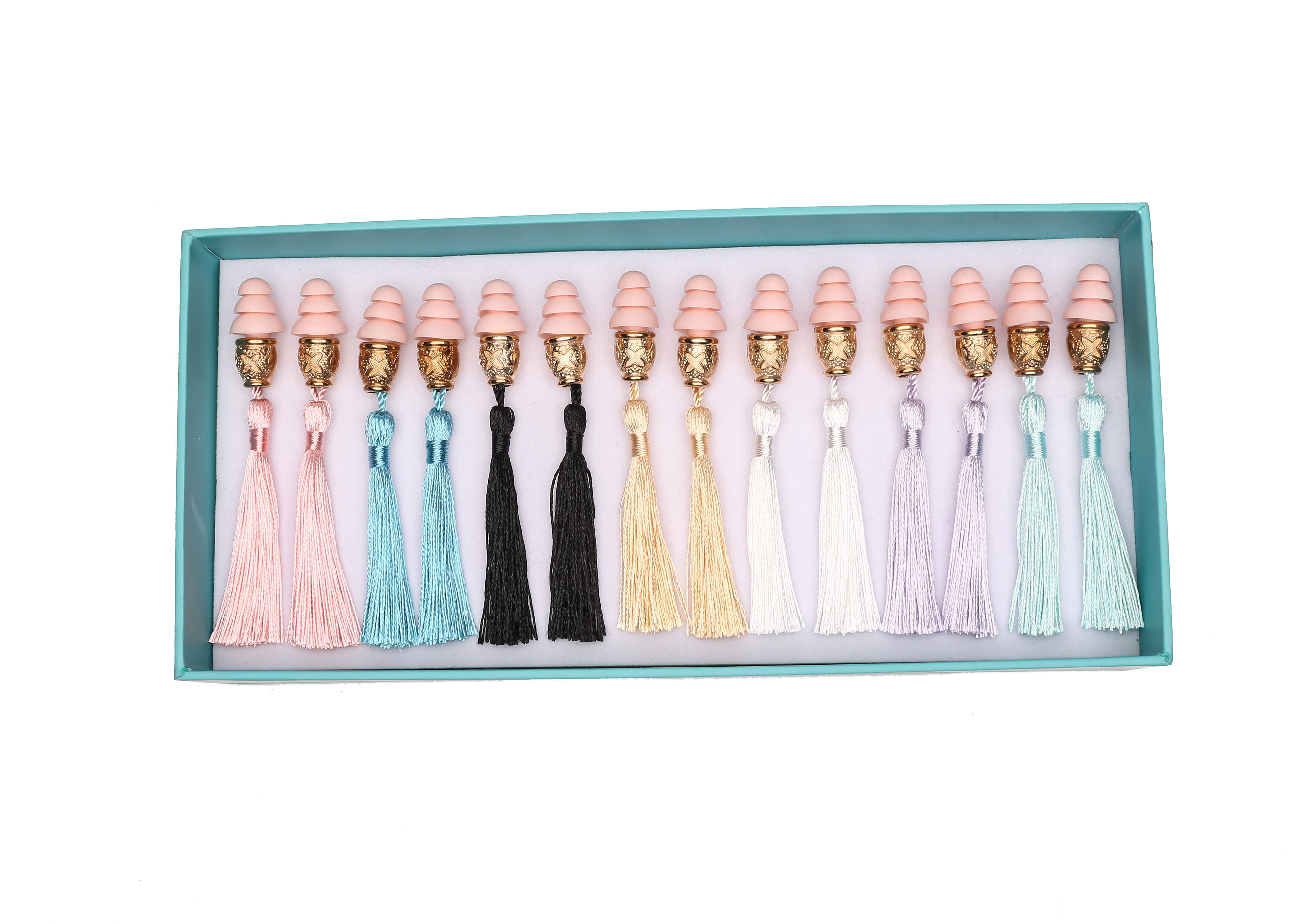 Now you can spoil the Audrey girl in your life with this exquisitely designed and handmade tassel earplugs in colors of the rainbow, one for each night as she dozes off to a night of beauty rest. Gift Set includes: Midnight Black, Dusty Rose, Lavender Dream, Moonlit Silver, Pale Moss, Turquoise Blue and Imperial Yellow