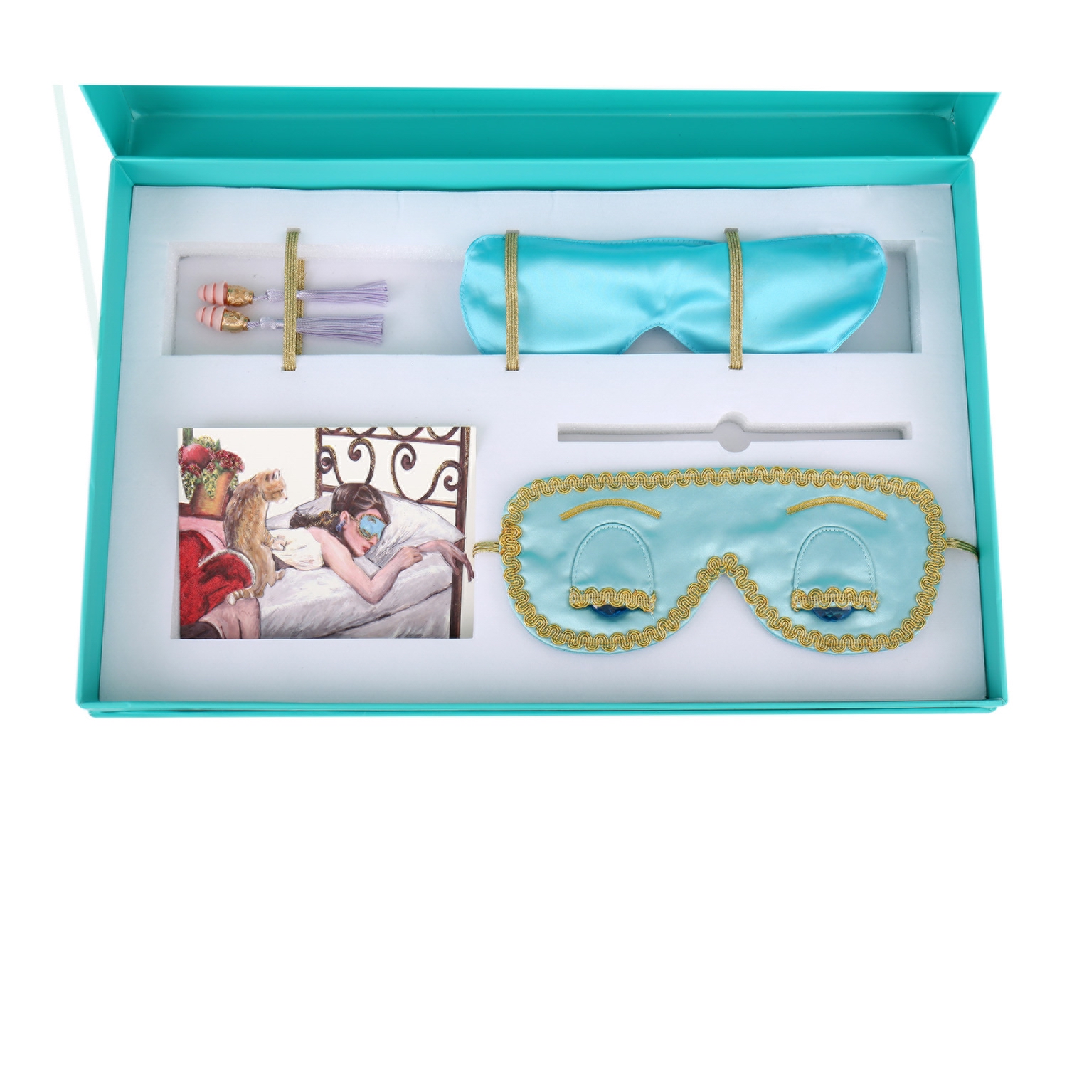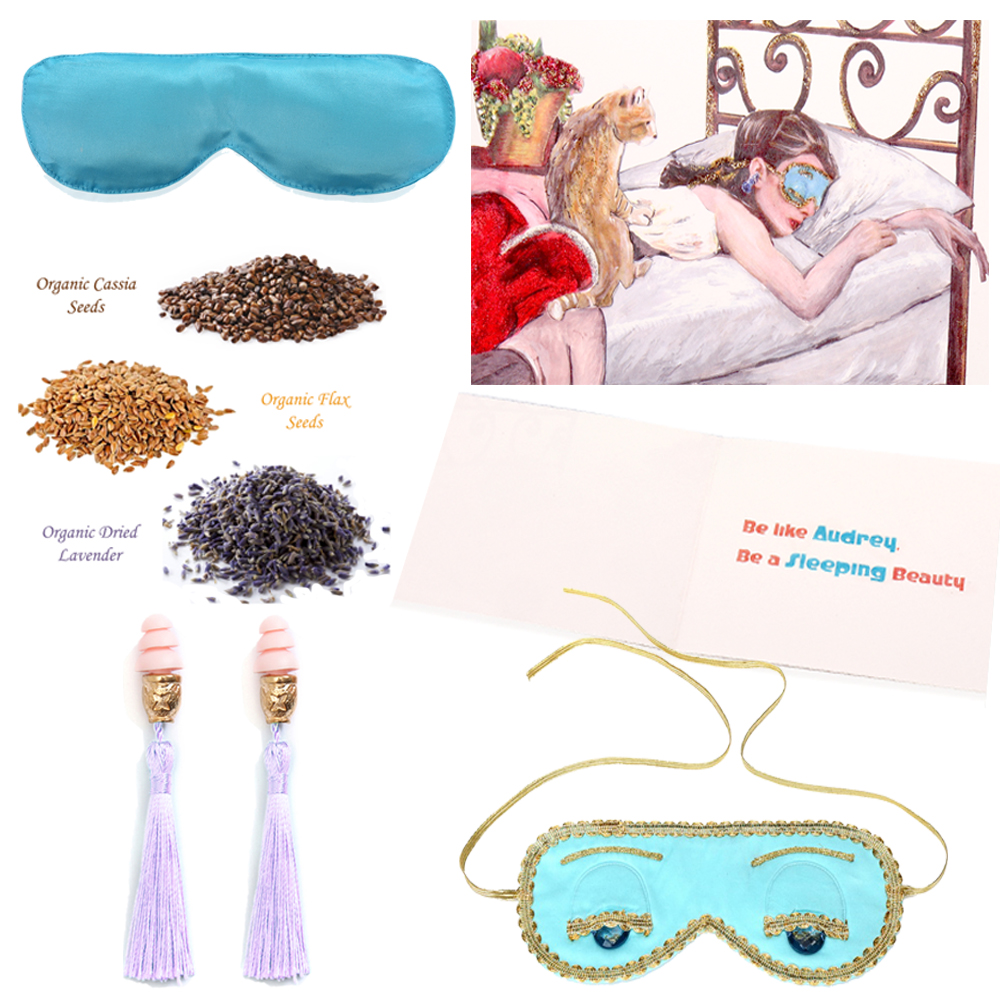 This exclusively designed greeting card features original, multimedia artwork co created by Jasmine and our in house artist Jinal Shah. The image captures the magical moment the world is introduced to the enchanting sleep mask and earplugs Audrey wore in Breakfast at Tiffany’s, which has since become the most iconic sleep set sought after decades after the movies’ debut.