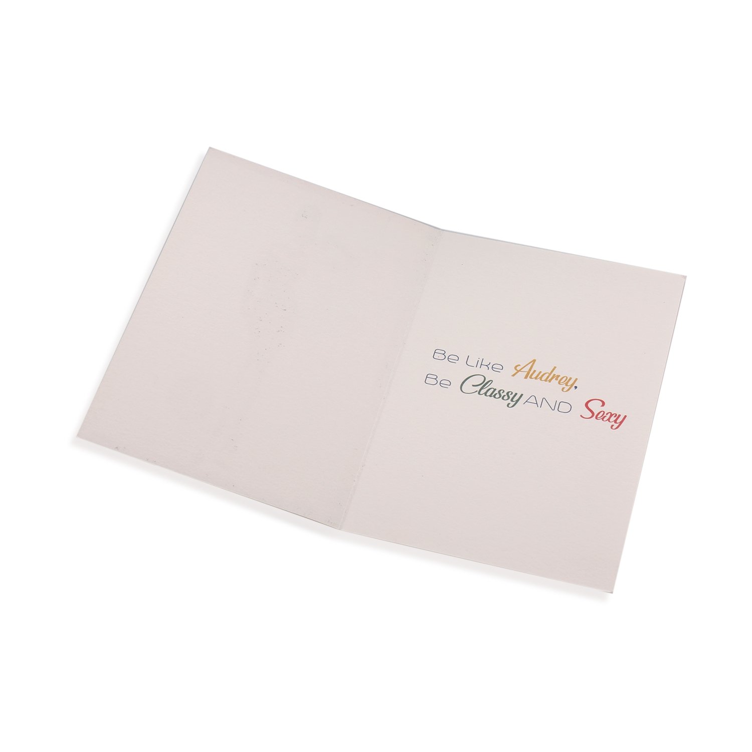 This exclusively designed greeting card features original, multimedia artwork co created by Jasmine and our in house artist Jinal Shah. The image features the iconic black dress and fabulous accessories worn in the opening scene from Breakfast at Tiffany’s.