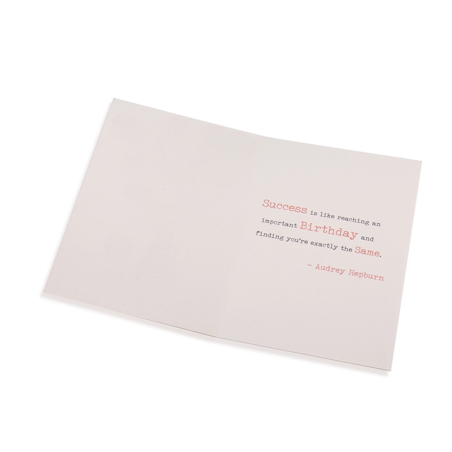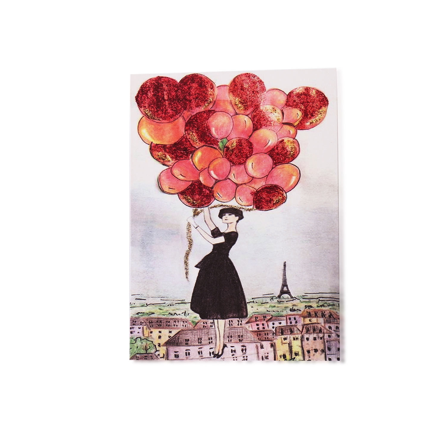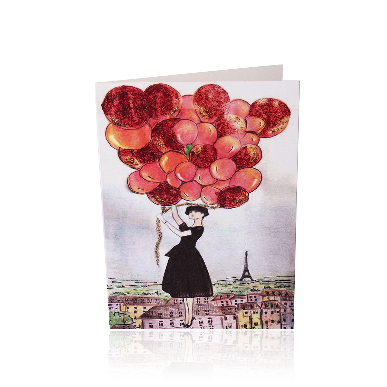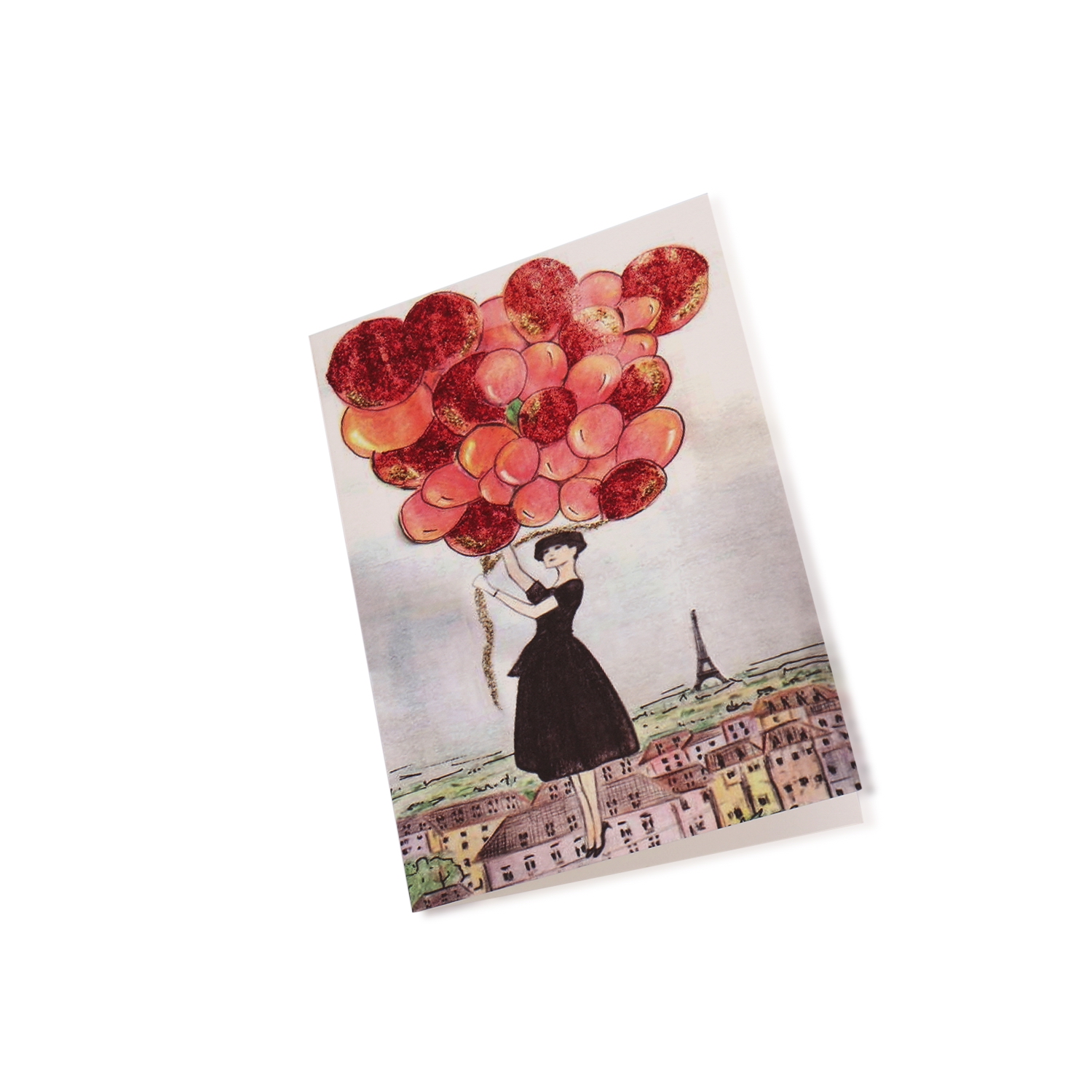 This exclusively designed birthday greeting card features original, multimedia artwork co created by Jasmine and our in house artist Jinal Shah. The image is inspired by a famous photo of Audrey holding red balloons in front of the Eiffel Tower. This cheerful card will surely bring that Audrey girl in your life the perfect birthday greeting regardless of her age.