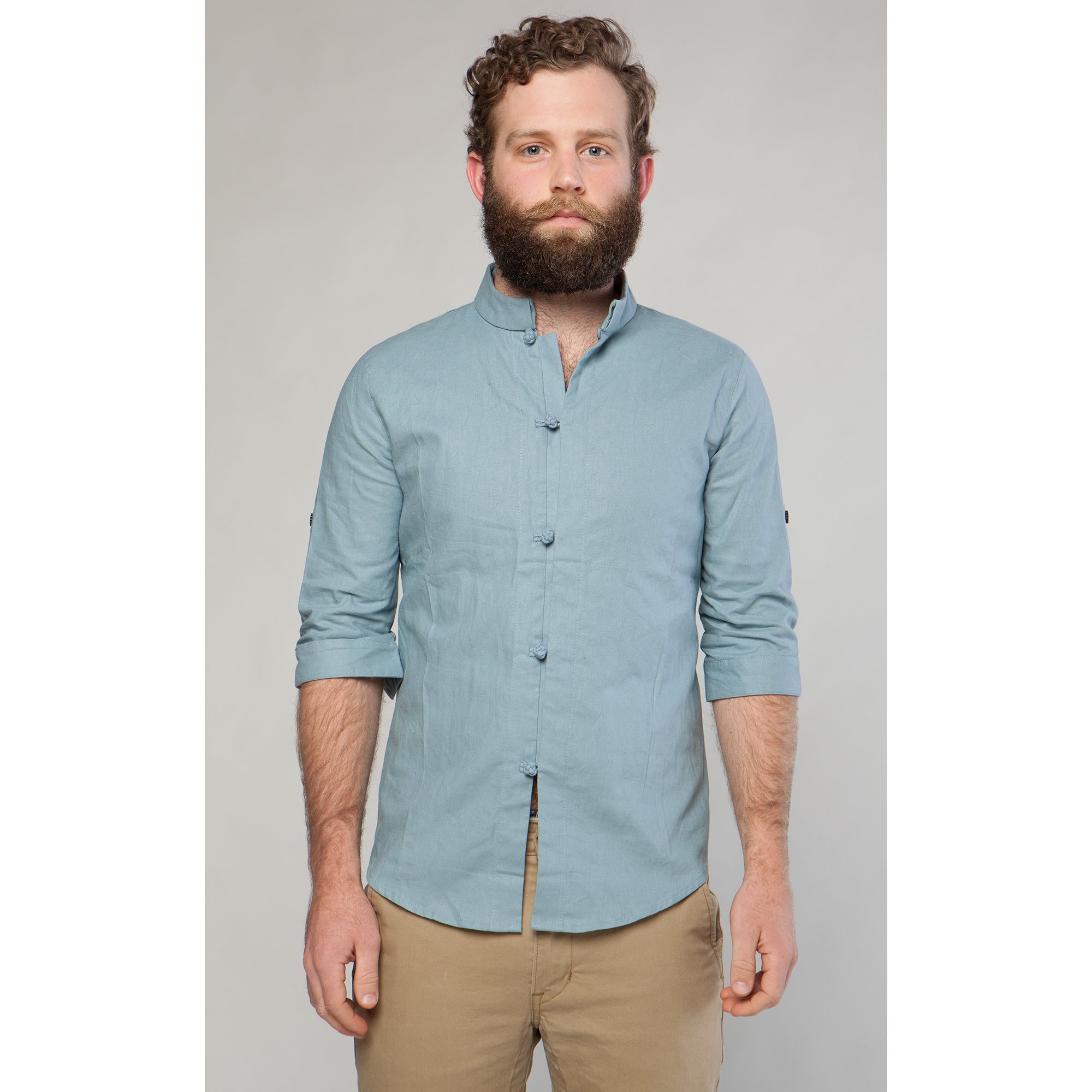this designer shirt hails from one of our favoriate emerging indie labels from china, who specializes in designing modern pieces that celebrates the iconic and timeless design elements from the ancient mandarin style. this one of a kind piece exemplifies the perfect balance between the fresh style and cut of a modern men's shirt perfectly styled with hand sewn mandarin buttons and collar to give it that worldly, less ordinary flare.