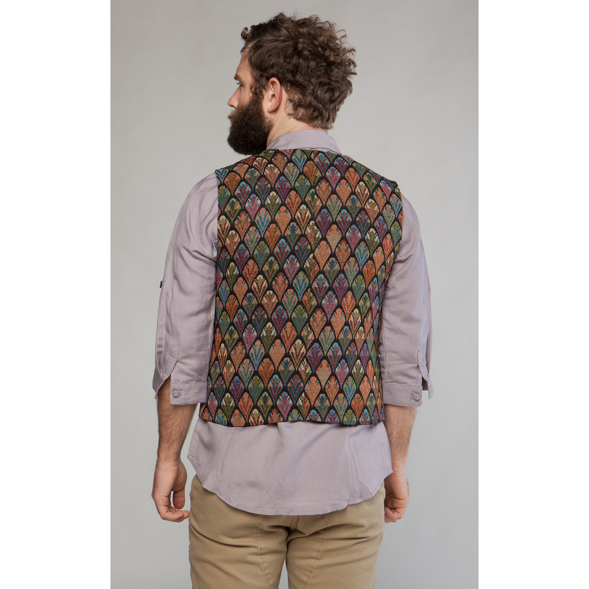 an intricate and colorful pattern make for an eye-catching men's vest that exudes confidence. with a built in pocket square you will be wearing a timeless and classy piece.