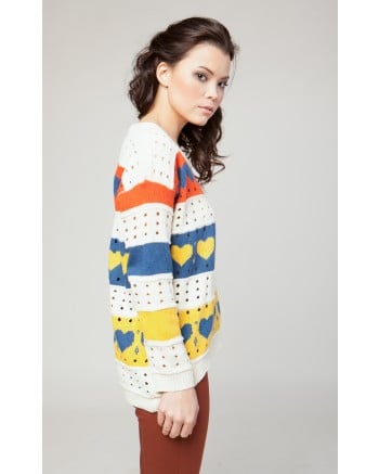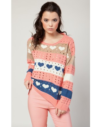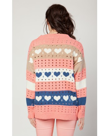 this uniquely designed sweater adds a sassy and playful twist to a classic basic by utilizing pops of color with a striped heart pattern and hole cutouts finishing the piece.